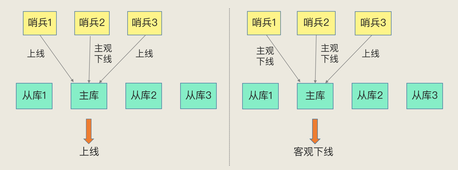 在这三个任务中,通知任务相对来说比较简单,哨兵只需要把新主库信息发给从库和客户端,让它们和新主库建立连接就行,并不涉及决策的逻辑。但是,在监控和选主这两个任务中,哨兵需要做出两个决策: